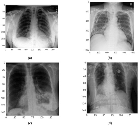 Comparison of the original and augmented images: (a) original image from CheXpert dataset; (b) original image from ChestX-ray14 dataset; (c,d) augmented images after preprocessing.