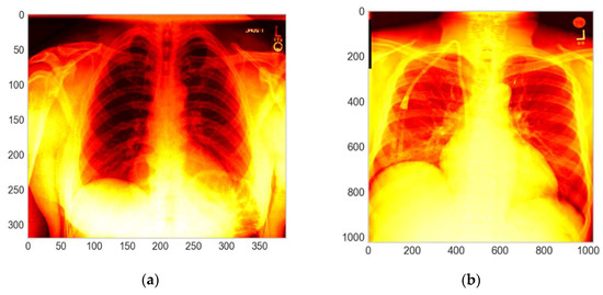 As one of the principal results of the EDA, we contemplated that the images of both datasets were from different dimensions, the images from [20] were of 320 × 390 pixels in the height and the width, respectively. On the other hand, the images from [21] were of 1028 × 1028 pixels in height and width. In addition, the images from both datasets were in the grayscale, which were homogenized. For this purpose, it is important to resize images to the same dimension, but to maintain a certain quality of the color scales (and allow greyscales to be comparable), the resizing needs to be in both cases a downscaling in order to obtain images with a similar quality for the two databases.