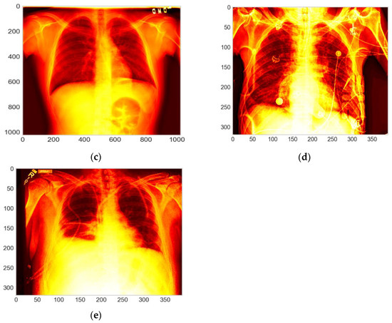 Chest X-rays (CXRs) of the five different lung diseases used in this work: (a) atelectasis; (b) cardiomegaly, (c) consolidation, (d) edema; and (e) pleural effusion.