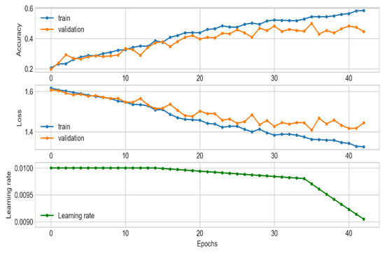 For the training process, we set up the training for 100 epochs, we used the adaptive moment estimation (Adam) [40] optimizer with the configuration of Table 1, an initial learning rate (LR) of 0.01, and a batch size of 128. To optimize this process and avoid the overfitting state of the CNN, we used early stopping [30] to monitor the loss function on the validation set and the exponential decay [41] of the LR scheduling and the model weights checkpoint (Figure 5).