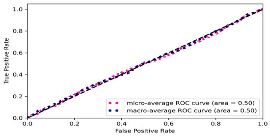 Figure 6 shows the ROC curve of the proposed algorithms. We carried out an ROC AUC analysis for the test set. We observed that the micro-average and macro-average ROCs are very close and both curves (ROC and AUC) are close and near linear, cutting the graph plane in two almost equal sets. We can then state that on the ROC AUC, the algorithm got about 50% (Figure 6). When considering the identification on a unique disease for each image, it seems evident that if associating each image with more than one disease the quality of the model would increase, but in that case, the need of a medical staff decision is also observed. Therefore, using the proposed algorithm as a way to support medical decisions by informing the presence of a disease but need a specialist to define in-depth what the disease is seems to be suitable and recommended in contexts with resource constraints.
