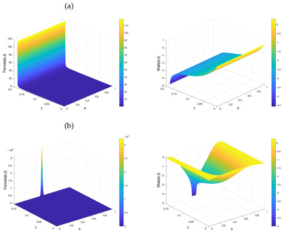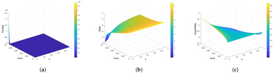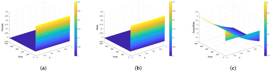 Revisions to the TYC model may remove this inconsistency present in current models. A promising revision and modification to the classical TYC model are models that include the strong Allee effect [11,23,42] and intraspecies competition [11] for females among males and supermales, and finite time effects [43]. Sexual selection, might also play a role herein. For example, if f selects m over the mutant male s, and so moves away from s, blow-up can be attenuated, see Figure 4 and Figure 5.