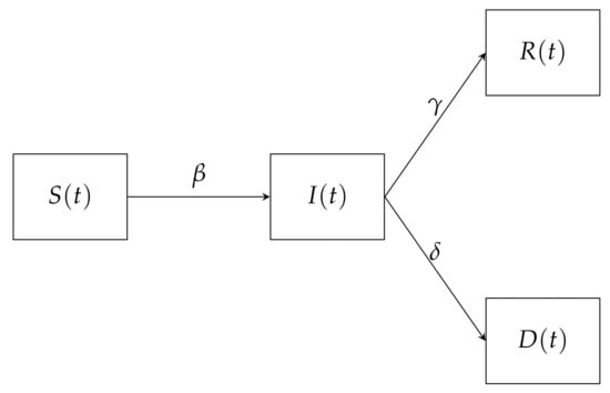 The Susceptible–Infected–Recovered–Deceased (SIRD) model used assumes that the population can assume four states, Susceptible (S), Infected (I), Recovered (R) and Deceased (D). The susceptible population is the group which can contract the virus, this contraction occurs at the rate . The infected population is the population group that has contacted the virus and it is still active. The infected group can be removed to either assume a recovered population at the rate or deceased population at the rate . This means is the death rate, is the infection rate and is the recovery rate. Figure 1 shows the resulting COVID-19 transmission SIRD flow diagram.