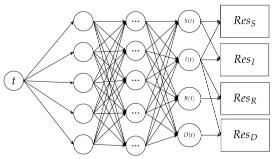 The difference between the right and left sides of an ODE is the residual error. The residual error is utilized to determine the neural network’s loss function in the construction of PINNs. We get four residual error functions from the SIRD model. We get , the residual error of the susceptible population, from Equation (23), which is the margin of how wrong the mathematically predicted susceptible population change is. We get from Equation (24), which is the residual error of the infected population, or the margin of error in the mathematically estimated active infection change. The residual error of the recovered population is given by Equation (25). We get the residual error of the deceased population from Equation (26), which is the margin of how much wrong the mathematically predicted deceased population change is.