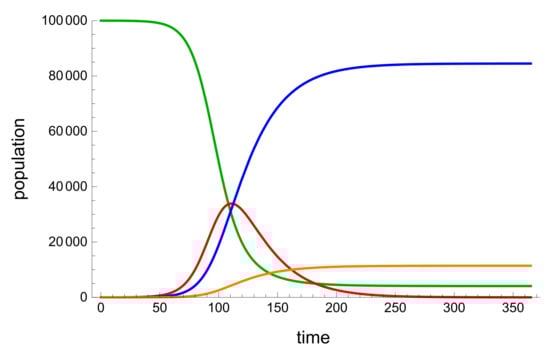 A Mathematica generated graph simulation of an example SIRD model. The green represents Susceptible population, blue represents the recoveries, red is the active infected population and orange is the deceased population.