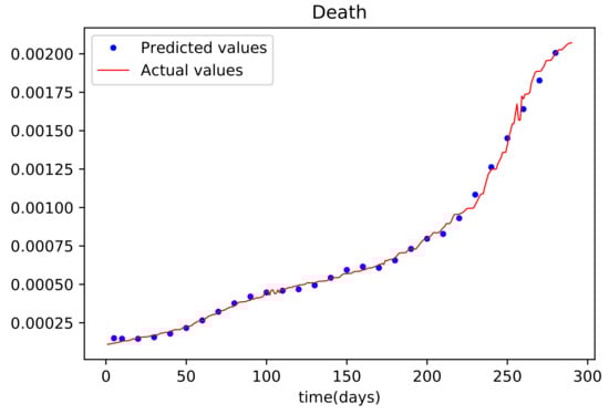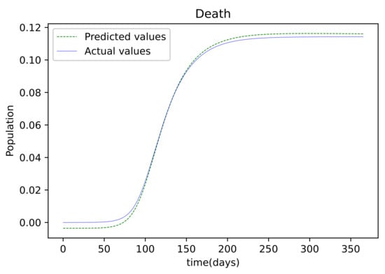 The findings provided after the model was trained were compared to the susceptible population, which was also utilized as the training dataset. There is only a small error between the two plots because they are so tightly aligned. Figure 4 depicts the resulting findings, which compare active infections from the dataset used to train the model to the values obtained by the trained model. This graph is well-fitting, indicating that it has a low degree of error. The graph in Figure 5 depicts the results of the recovered dataset used for training, as well as the produced results following the training process, which have a strong match and hence less errors. Figure 6 shows the outcome of comparing the actual deceased with the results acquired after the training procedure; this graph has a good match but is less accurate than the others.