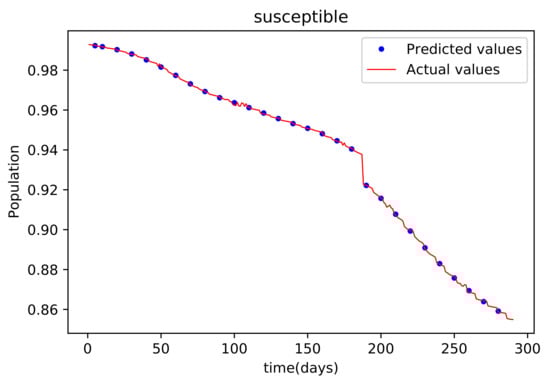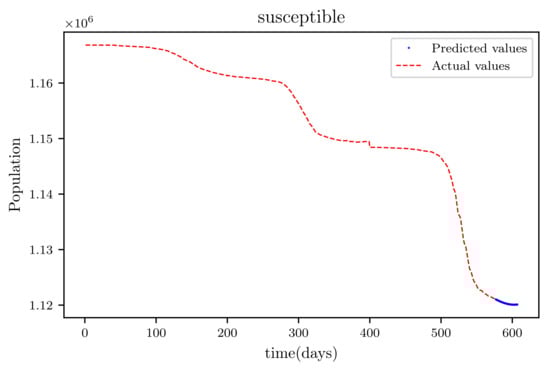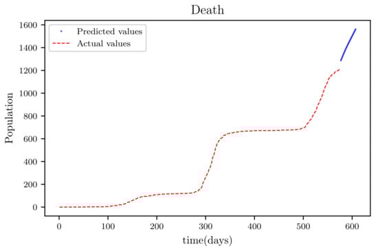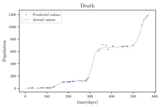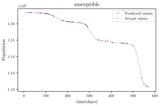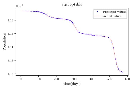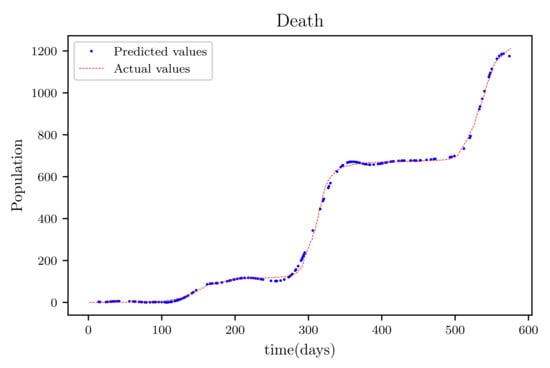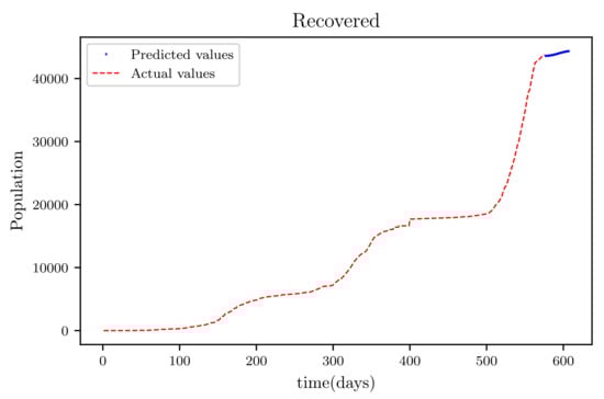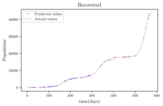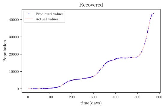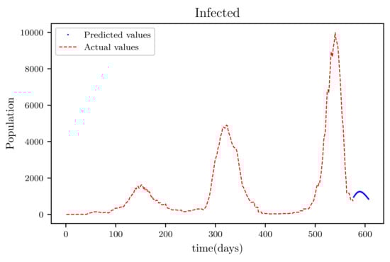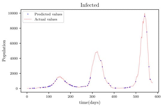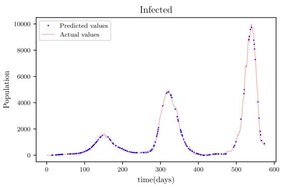 The results obtained showed high accuracy especially in data fitting compared to the mathematical method’s accuracy [], particularly in data fitting. Another feature of this model is that it anticipates the wave behaviour of the active infected population as it makes forecasts. In comparison to other PINNs techniques, the model achieved roughly similar results, while a convolutional neural network time varying model [,] outperformed it somewhat. The method’s major flaw is that it relies on previous data. This reduces its efficiency when it becomes accustomed to forecasting data, especially if the anticipated time is extended, because other previously unforeseeable factors, such as new species, are introduced.