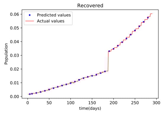 This graph shows a comparison of the predicted values of recovered population and the actual data of recovered population for a SIRD model with future predictions.