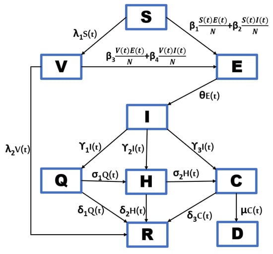 In this model, we assume that vaccination does not provide complete protection against COVID-19. As a result, the rate of being vaccinated is