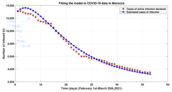 . The fit of the number of individuals infected with COVID-19 in Morocco is described in