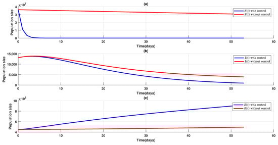 Figure 4: susceptible, infected and recovered without and with optimal control effect. These simulations show that optimal control increases the number of susceptible and recovered people while decreasing the number of infected individuals. The effect of control on the susceptible and recovered populations is obviously more significant since the susceptible and recovered populations rose four-fold in 50 days while the infected population declined by one fold during the same period. This means that the control is very effective for all of these three compartments.