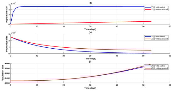 Figure 5. Clearly, the vaccinated population benefits more from the optimal control than the exposed population since the control aims to improve vaccination effectiveness. The control strategy, on the other hand, has no obvious effect on the number of deaths.
