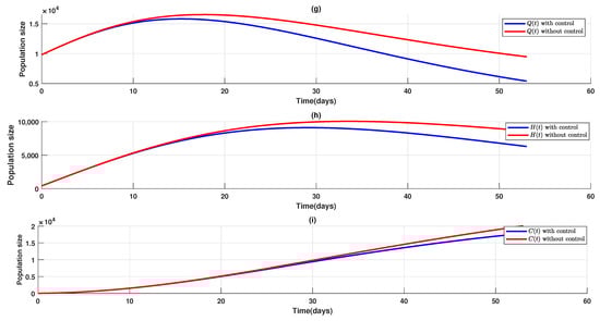 Figure 6, the control strategy reduces the number of isolated populations (at home or in hospital). However, there is more benefit to controlling the population with mild symptoms compared to people in the hospital with severe or critical symptoms. When applying the control to all three categories of quarantined, hospitalized, and critical cases of COVID-19, it is clear that the control is obvious.
