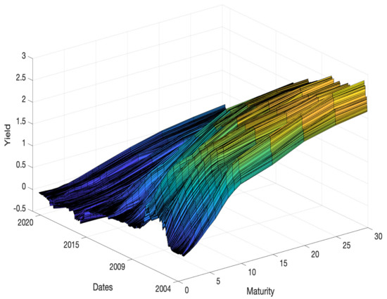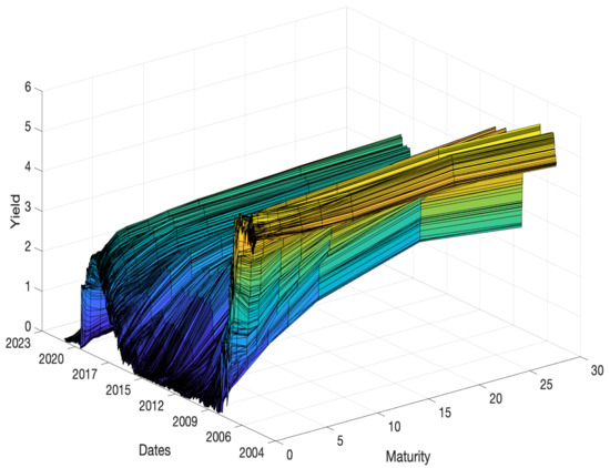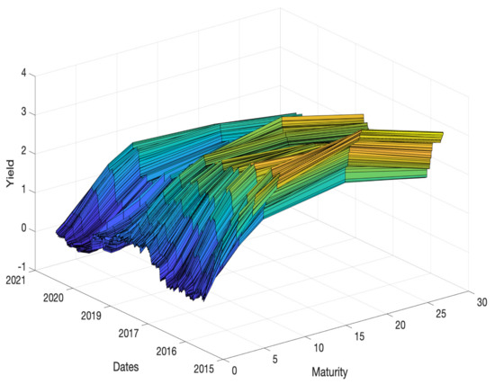 To analyze term structure, researchers have produced large body of literature that includes a wide variety of models. Nelson and Siegel [4] is famous paper on period structure modeling. The authors assumed that if the model mirrors the standard shape of the term structure instead of approximating it within some tolerance, then it is possible to predict interest rate curves and reasonable prices that deviate from the sample data collected in the study. Their results on US Treasury bill data revealed a high correlation between the current value of a long-term bond indicated by the appropriate curves and the bond’s market price. Subsequently, many studies, e.g., Pooter [5], Koopman et al. [6], Luo et al. [7], and Subramanian [8], have expanded the Nelson–Siegel method for various situations and to include additional factors. Similarly, Svensson [9] expanded the three-factor Nelson–Siegel model to a six-factor model to describe term structure. Christensen et al. [10] uses five different factors (level, two kinds of slope, and curvature) in the Arbitrage-Free Generalized Nelson–Siegel model.