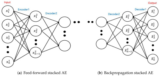 We can observe the visible units x, which are corrupted by b (the bias) and denoted as . is produced in the encoder and denotes the weights between and Similarly, represents the weights in the decoder task. Function h compresses the input data x. For backpropagation, is responsible for using the latent space h and reconstructing input data x. However, the basic form of the AE has a fatal flaw. When the architecture consists of too many hidden layers and units, the amount of calculation can dramatically increase. In addition, the updating value of w decreases, which is called the vanishing gradient. To handle this problem, Bengio et al. [43] introduced the deep belief network and developed the stacked AE. As shown in Figure 5, the output of each previous layer is connected to the input layer to preserve the parameters of the features. The stacked AE inherits the benefits of a deep network, which has greater explanatory power.