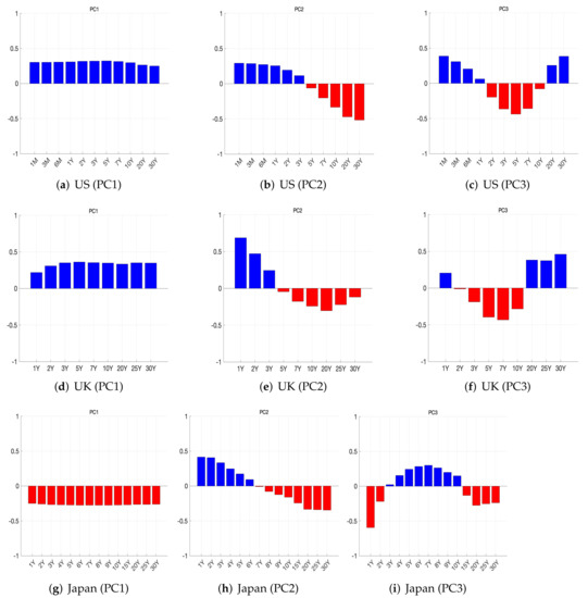 Furthermore, we display the shape of the first three principal components for the three countries in Figure 6. As shown, PC1, PC2, and PC3 indicate level, slope, and curvature, respectively. Similarly, they indicate level, slope, and curvature in the interest rate term structure (Lord and Pelsser [44], Fabozzi et al. [45]).