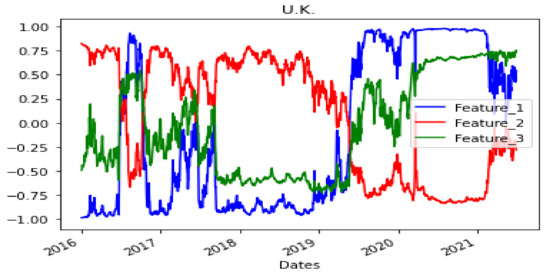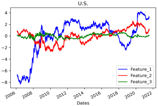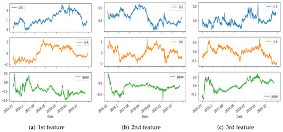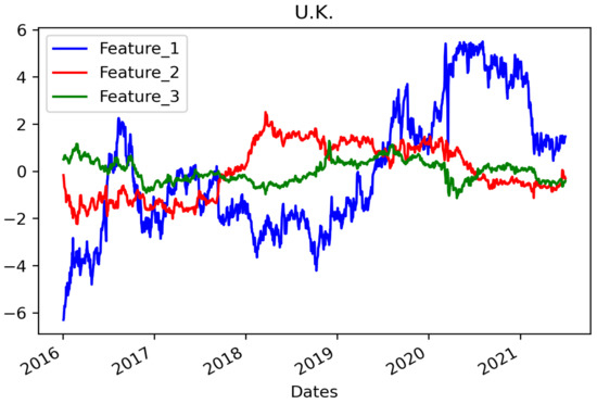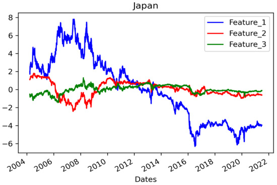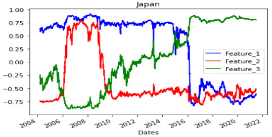 The top three PCs account for 99.78% of the US data. Each feature value time series is shown in Figure 7. For the UK, 98.74% of the data can be explained by three components whose features are shown in Figure 8. Finally, in the case of Japan, the three PCs represent 99.79% of the data, and the features are displayed in Figure 9.