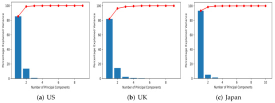 The explanatory power examined as a scree plot is shown in Figure 11. Because for all three countries, the first component accounts for 80% or more of the data, the scree plots have an extremely biased shape. In particular, in the case of Japan, because the first component explains 93% of the data, this graph has the most bias. In addition, the third and subsequent components all have a ratio that is difficult to determine from the graph.