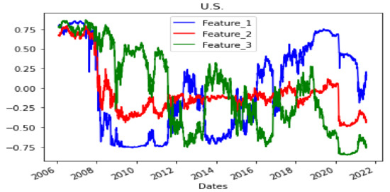 In the results obtained for the US data (Figure 12), features 1 and 3 have symmetrical movements, starting from a point where the three features are similar. Moreover, it was confirmed that the symmetrical movement of the two features about one axis is commonly observed with different seed values and for data from other countries.