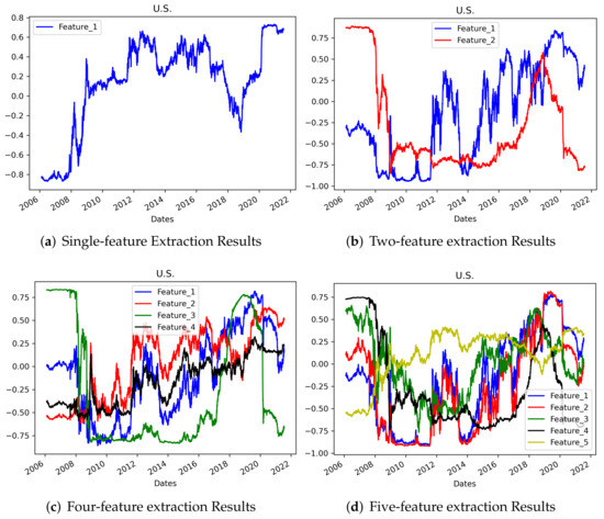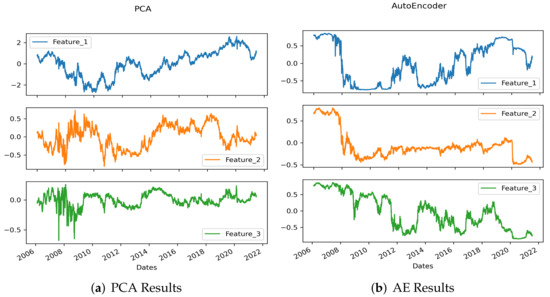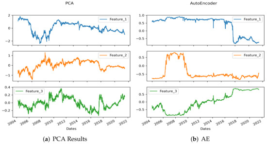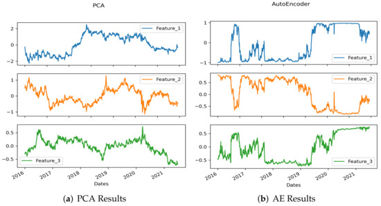 The features extracted by PCA and the AE for the US data are visually compared in Figure 15. At first glance, it seems that the shape of the graphs are similar for feature 1 of both the AE and PCA results. However, even if the scale is modified and the correlation of each date is considered, the results cannot be considered similar. Comparing feature 1 of PCA with feature 2 of AE using a similar scale, it can be seen that the two curves move in a completely different way.