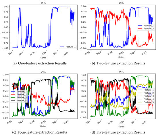 In addition, Table 3 and Table 4 present the correlation coefficients when different numbers of features are extracted in the AE process. Five features were extracted and compared with the results when one to five features were extracted. Table 3 shows the results for one to three features, and a high degree of correlation between the results for five features can be observed throughout the table. In particular, for the UK data, the result when only one feature is extracted and the result when five features are extracted are quite similar. As noted above, the number of samples in the dataset is only 1389, and hence fewer features are observed. Therefore, when the term-structure data are compressed using an AE, more features of the entire period should be observed as the number of samples in the dataset increases. However, it is difficult to see the UK’s relatively stable feature graph form as having the same meaning because the interest rate changes in each country are different. However, a pattern was not found according to the order of features; likewise, a particular form was not seen in each country.