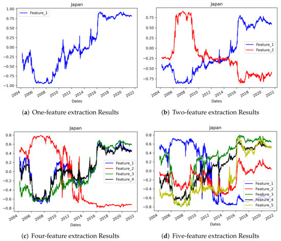 In addition, the number of layers and density seem to be the most important parameter values to set. Hence, we trained term-structure analysis models that extract one to five features. The layers were set the same, but the density of the middle layer was valued from one to five nodes, and the other settings including the seed value were set to the values used for the model that extracts three features. When one to three features were extracted, no common features or singularities in the shape of the graph were observed for each country. However, when four or more features were extracted, overlapping features were observed in three countries. Although the number of overlapping features differed by country, the correlation coefficient between at least two features was at least 0.923 and the highest value was 0.950 (between features 1 and 2 for the US data). This could be observed intuitively in the graphs, as shown in Figure 18, Figure 19 and Figure 20.
