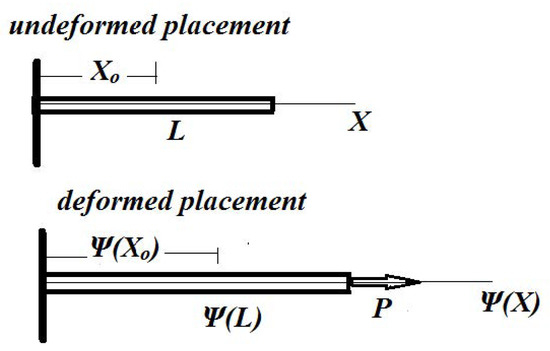 In the present section, the Λ-fractional deformation of a fractal bar under axial loading is discussed. Suppose that a bar, fixed at one end, is deformed by the application of an axial load p at its other end. The bar is Λ-fractionally deformed. Figure 2 shows the undeformed xo and the deformed ψ(xο) placements of the bar in the initial space.