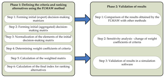 As can be seen from Figure 1, the model has two phases: the phase of application of the FLMAW method (definition of weight coefficients of criteria and ranking of alternatives), and the phase of validation of the obtained results. The applied methods are presented below.