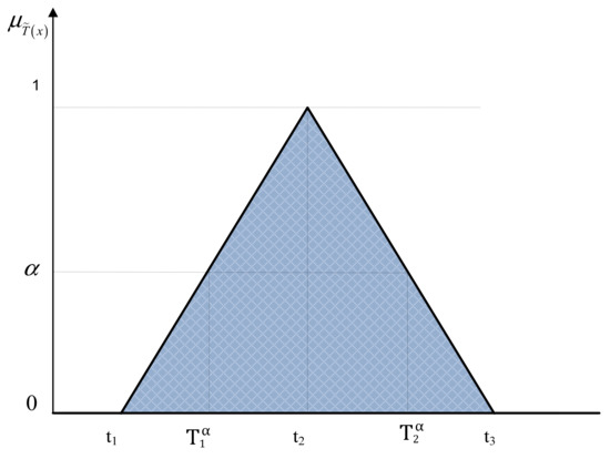 The concept based on which the fuzzy number is expressed using confidence intervals and relevant confidence degrees is suggested by Kaufmann and Gupta [48]. Considering Figure 2, the confidence interval presents a closed set [t1, t3]. Therefore, a fuzzy variable can have the values only from the confidence interval. Defining confidence interval of every fuzzy variable is the task of the planner, and the most natural and often used solution is to adopt a confidence interval so that it matches the physical limits of the variable [49]. If the variable has no physical origin, some of the standard ones are adopted or it is defined as an abstract confidence interval [42]. The degree of membership is the value related to the confidence interval. In Figure 2, the confidence interval with the membership degree α can be observed, marked as .