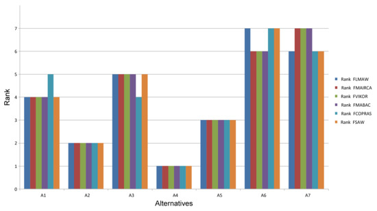 From Table 13 it can be observed that the smallest losses are in the alternatives A4, A2 and A5, which are the three first-ranked alternatives using the FLMAW method. When the value v is observed, the difference in ranks is noticeable only in the fifth-ranked and sixth-ranked alternative. If the value t is observed, the difference in relation to the rank obtained by applying the FLMAW method is in the change of place of the sixth-ranked and seventh-ranked alternative, respectively, the fourth-ranked and fifth-ranked alternative. The SCC is very high in the relation of the FLMAW and the value v and it is 0.964, while in the relation of the FLMAW and the value of t it is 0.929. Both values indicate a high correlation of ranks. Therefore, it can be said that the FLMAW model provides good and stable results.