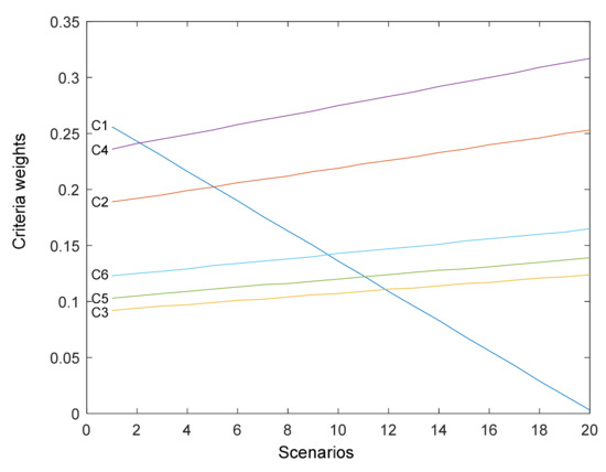 In the second step, the sensitivity analysis of the FLMAW method to the change of the weight coefficient of the most influential criterion (C1) was performed. This manner of sensitivity analysis is shown in a large number of papers, such as [27,55,56,57,58]. For this purpose, 20 scenarios (Sc) were developed, where in the first step the value of the weight coefficient of the criterion was reduced by 4%, and in all the following ones by 5%. The value of the reduced part of the criterion C1 is evenly added to the values of the weight coefficients of the other criteria. This ensured that the sum of the weight coefficients of the criteria in each scenario was equal to one. The overview of the weight coefficients of the criteria according to the scenarios is given in Figure 4.