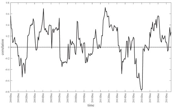 There is a fascinating phenomenon by which, although the correlation between housing and financial market returns is usually close to zero in the long-term measurement, the correlation actually is significantly non-zero in the short-run. Furthermore, the correlation is always negative before financial/economic crises and positive during and after crises. Meen [] measured the correlation of the UK and showed that, for example, the correlation between house capital return and FTSE return is 0.08 during the period of 1970–2012 but −0.66 during the period of 2001–2005 and 0.69 during the period of 2006–2012. Related works [] have mentioned this phenomenon too. We also measured the correlation between US housing capital return and S&P return and obtained supporting evidence. For China, the long-term correlation was 0.04 during the period of 2000M04–2020M06, and the short-term correlations were calculated based on the sliding window method, with the window width equal to the last 12 months, as shown in Figure 1.