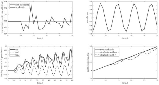 Figure 2 shows the key results of the simulation. The first frame shows the stochastic and non-stochastic real income growth rates over 25 years (periods). The second frame shows the generated sine shape correlation. To reflect the properties of risk premium terms, the third frame shows 55 years of results. Doubtlessly, since tau1 is determined by the correlation, it also reflects a sine shape movement. As in the analysis and simulation shown by Wang et al. [], tau2 is increasing in recent years in China. Tau, the sum of the two, also reflects a strong cyclicity, but compared with tau1, the peaks are wider, and the troughs are narrower, indicating that housing market risk premiums in most of the periods have the relatively strong ability to restrain house price growth; when the financial market and housing market are negatively correlated, the restrictive ability will Decrease and thus cause housing price bubbles. As clearly shown by the fourth frame, when the risk premium terms are involved, there will be obvious periodicity in house prices. Therefore, although housing market risk premiums have a negative impact on real house prices, the natural change is not conducive to stabilizing house price. For instance, real house prices decreased 9.6% in the two years from period 18 to 20 and fell 9.3% in one year from period 25 to 26. These simulated values support our view that the effect of financial market factors on housing market risk premiums, as well as real house prices, cannot be ignored in practice and should be of sufficient concern in both theoretical studies and government policy making.