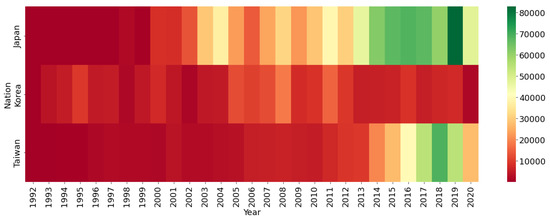 The heatmap of annual labor exports to Japan, Taiwan, and Korea.