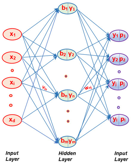 BNPP can learn and store various data, akin to the human brain. Therefore, a single hidden layer is represented in Figure 3. Furthermore, BPNN has three layers: an input layer, at least one hidden layer, and an output layer. Weights connect adjacent layers, always scattered among 0 and 1. Although several heuristic techniques have been deployed by many researchers [37,38], there is no systematic theory for verifying the number of input nodes and hidden layer nodes. Experiments or trial and error based on the test data’s least mean square error are the most fitted methods for determining the appropriate indicators of input and hidden nodes. The following Equations (1) and (2) indicate the relationships of McCulloch–Pitts (M–P) neurons in hidden layer and the output layer [39].