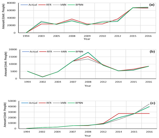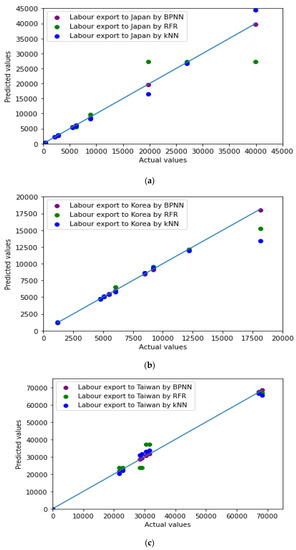 Line graphs in Figure 4 illustrate the RFR (red lines), kNN (grey lines), and BPNN (green lines) algorithms using testing data that were compared with the actual line graphs (blue lines). As far as the predicted models of labor immigration in the three nations are concerned, the BPNN lines are the nearest ones compared with the real data in Taiwan, Korea, and Japan. As a result, the grey lines show that kNN algorithms achieve the second-most accurate level in Taiwan and Japan, whereas kNN only achieves the lowest level in Korea in a selection of random years from 1994 to 2016. Therefore, the accuracy parameters for the labor immigration forecast are calculated (as shown in Table 3) to assess the three forecasting models’ accuracy levels. The outperform of the simulation in Table 3 indicates the estimation accuracy using kNN, RFR, and BPNN algorithms has a significant reliability.