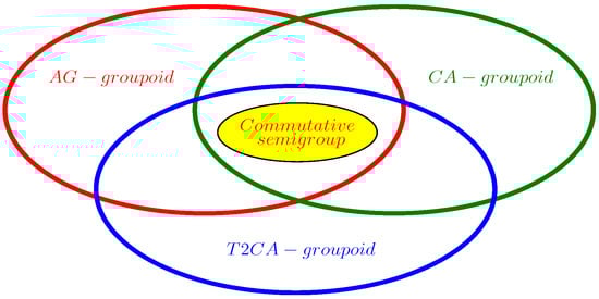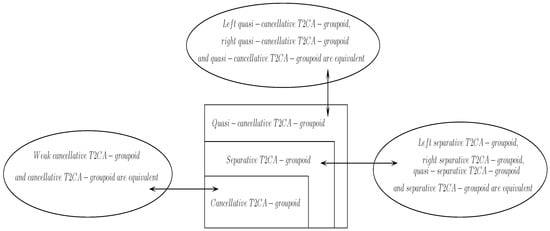 The rest of this paper is arranged as follows. In Section 2, some definitions and properties on the CA-groupoid and T2CA-groupoid are given. We study the relationships between the T2CA-groupoid and other groupoids in Section 3. The quasi-cancellativity and cancellativity of CA-groupoids are discussed in Section 4. We discuss the quasi-cancellativity and cancellativity of T2CA-groupoids and study the relationships between them in Section 5. Finally, Section 6 presents some conclusions and the direction of future efforts.