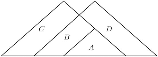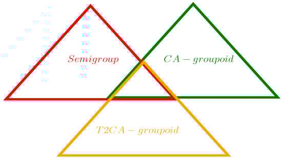 In Figure 2, there are three triangles of different colors. The red triangle represents the semigroup; the green triangle represents the CA-groupoid; and the orange triangle represents the T2CA-groupoid. We can see from Figure 2 that between the three algebraic structures—the semigroup, CA-groupoid and T2CA-groupoid—the intersection of any two is the proper subset of the third.