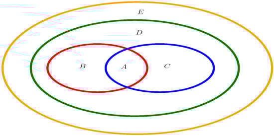 A stands for both the power cancellative T2CA-groupoid and cancellative T2CA-groupoid shown in Example 6; B stands for the power cancellative T2CA-groupoid shown in Example 7 rather than the cancellative T2CA-groupoid; C stands for the cancellative T2CA-groupoid shown in Example 8 rather than the power cancellative T2CA-groupoid; D stands for the separative T2CA-groupoid shown in Example 9, which is, however, neither a power cancellative T2CA-groupoid nor a cancellative T2CA-groupoid; and E stands for the quasi-cancellative T2CA-groupoid shown in Example 10 rather than the separative T2CA-groupoid. A + B, which is the red ellipse, stands for the power cancellative T2CA-groupoid; A + C, which is the blue ellipse, stands for the cancellative T2CA-groupoid; A + B + C + D, which is the green ellipse, stands for the separative T2CA-groupoid; and A + B + C + D + E, which is the largest orange ellipse, stands for the quasi-cancellative T2CA-groupoid.