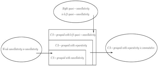 Furthermore, we successfully solve two open problems in [27]. We prove that weak cancellativity is cancellativity and right quasi-cancellativity is left quasi-cancellativity in a CA-groupoid (see Theorems 7 and 8). The relationships among separativity, quasi-cancellativity and commutativity in a CA-groupoid were discussed (see Figure 3), thus clarifying the structure of a CA-groupoid. Figure 6 shows the main results obtained for the CA-groupoid in this paper.