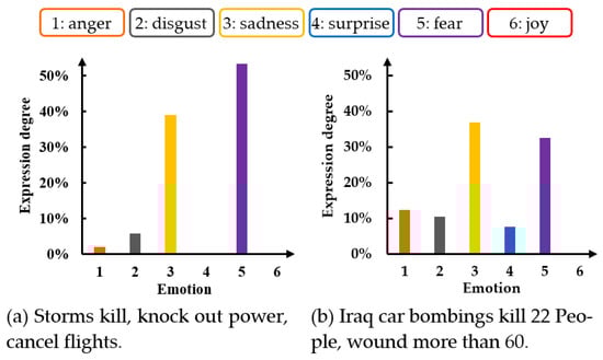 Expression degree of two example sentences in the Semeval dataset of six basic emotions. (a) Emotion distribution of sentences with main emotion label is fear; (b) Emotion distribution of sentences with main emotion label is sadness.