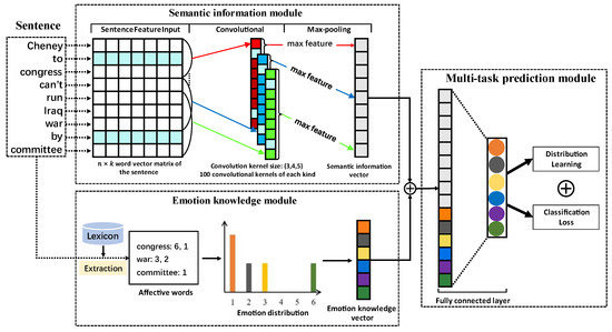 To address this problem, we propose a text emotion distribution learning model based on a lexicon-enhanced multi-task convolutional neural network (LMT-CNN). The overall architecture of the LMT-CNN model has three major modules: semantic information, emotion knowledge, and multi-task prediction. The semantic information module uses the sliding window convolution neural network to extract the semantic information of the text from the word embedding space of the input text. Based on the affective words extracted from the text, the emotion knowledge module uses the lexicon to introduce the corresponding emotional prior knowledge to synthesize an emotion knowledge vector. The input of the multi-task prediction module is constructed from the outputs of the first two modules. Then, the final emotion distribution is predicted through a full connection layer. The two prediction tasks of the emotion distribution output layer are emotion distribution prediction based on Kullback–Leibler (KL) loss [17] and emotion classification based on cross-entropy loss. The emotion with the highest score in the emotion distribution output layer is used as the dominant emotion output for emotion classification. The existing EDL research work shows that the multi-task convolution neural network model combined with KL loss and cross-entropy loss can achieve better performance by simultaneously training emotion distribution prediction and emotion classification tasks in an end-to-end manner [15].