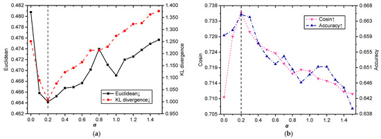 The Influence of the weight coefficient on the performances of the LMT-CNN model on the Ren-CECps dataset (↑ means that the larger the indicator is, the better, and ↓ means that the smaller the indicator is, the better). (a) Euclidean and KL Divergence; (b) Cosine and Accuracy.