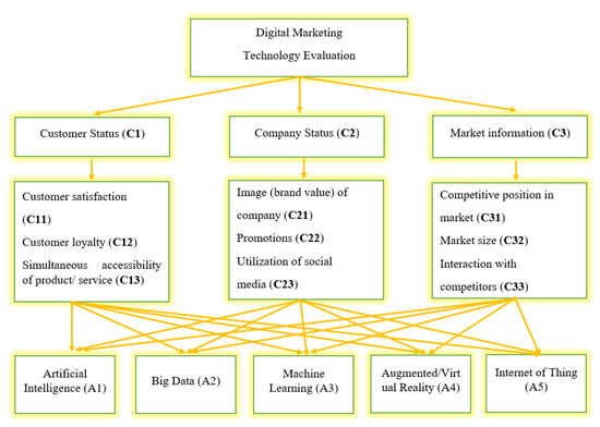 In this research, a fuzzy linguistic MCDM method for evaluation of digital marketing technologies included Artificial Intelligence (A1), Big Data (A2), Machine Learning (A3), Augmented/Virtual Reality (A4), and the Internet of Things (A5). Based on experts opinions and literature reviews, there are three sub-criteria of this, and each main criterion is shown in Figure 3.