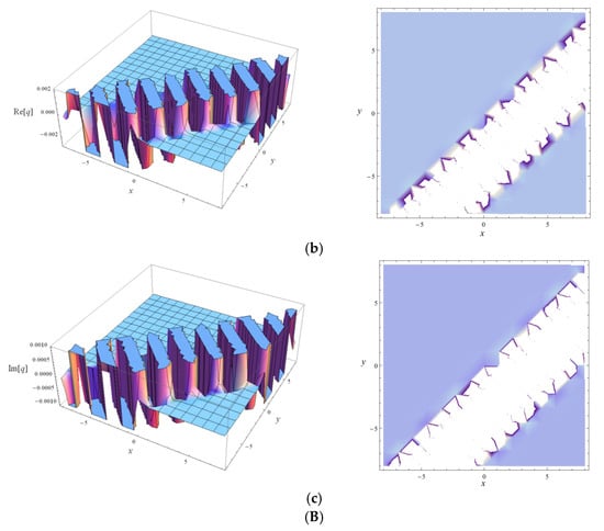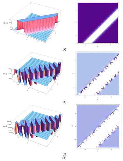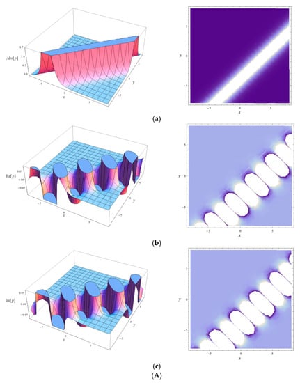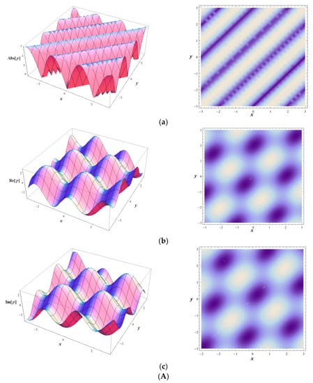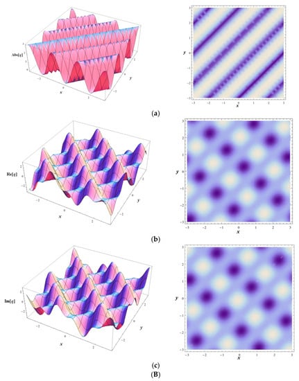 We plot the absolute part (AP), real part (RP) and imaginary part (IP) of the PWSs given by Equation (42) through 3-D polt and density contours in Figure 1 for . Obviously, the AP, RP and IP of the solutions all have perfect periodic characteristics, that is, the profile of AP is a perfect wave, on the hand, the contours of the RP and IP are the kinky-perfect waves. They represent the periodic wave propagating along the x-axis and y-axis.