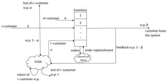 3. A p-customer that has already received an inventory can demand additional inventory after a positive random time (delayed feedback). More specifically, each served p-customer, according to the Bernoulli scheme, either leaves the system w.p. β permanently, or with a complementary probability of 1 – β, goes to the orbit to repeat its request. Customers that require re-servicing are called feedback customers (f-customers). It is considered that the orbit for r-customers and f-customers is common, and in the orbit, these customers are considered identical. Therefore, further customers in orbit, regardless of their type, are simply called retrial customers. Customers from the orbit arrive with a constant intensity, i.e., the intensity of the arrival of r-customers does not depend on their number in the orbit. This means that only the r-customer at the head of the orbit can repeat the request to obtain the inventory. The time between arrivals of r-customers has an exponential d.f. with parameter η. It is believed that r-customers can repeat their requests many times, i.e., if at the moment of arrival of the r-customers the inventory level is equal to zero, then according to the Bernoulli scheme, they either leave the orbit w.p. γ, or with a complementary probability of 1 – γ, remain in the orbit to repeat their request;