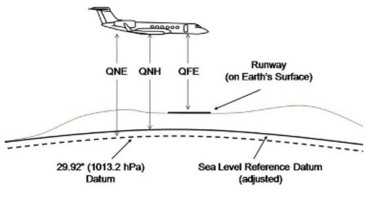 Flight Level (FL)/Pressure Altitude is an indication of pressure, not of altitude. FL is used to ensure safe vertical separation between aircraft. It is defined as a vertical distance of an aircraft above the isobaric surface (an isobaric surface is an invisible landscape that connects all points with the same atmospheric pressure.) of 1013.25 hPa (hecto Pascal) or 29.92 in Hg (inches of Mercury) and is separated from other such surfaces by specific pressure intervals. It is also known as QNE. In aviation, 1013.25 hPa/29.92 in Hg are referred to as the standard altimeter setting. The Flight Level is represented by FL, with the altitude in hundreds of feet (while being a multiple of 500 ft) and so always ending in 0 or 5. FL is followed by three digits, for example, 10,000 feet become Flight Level 100 = FL100; 3500 feet become Flight Level 035 = FL035. FL is an altitude flown on the standard QNH setting of 1013.25 hPa or 29.92 in Hg. By this, it is ensured that each aircraft is flying with reference to the same setting, which implies less chance of flying into each other. The airfields have different QNH (local altimeter settings) values because of differences in locations. Consequently, the 1013.25 hPa isobaric surface is a fictive curve that can be greater/lower than the mean sea level surface.