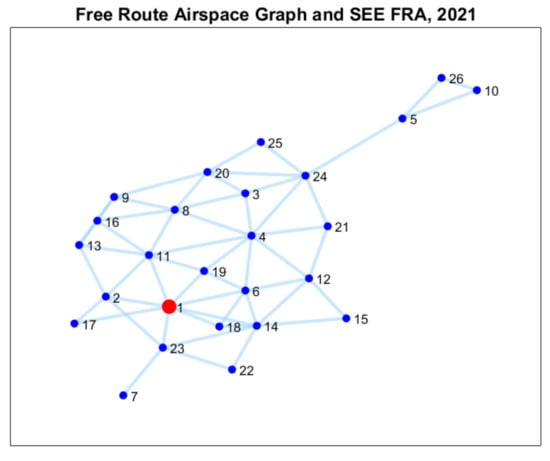 11]). FRA is one of the essential Air Traffic Management (ATM) functionalities (ATM—The dynamic, integrated management of air traffic and airspace, including air traffic services, airspace management and air traffic flow management. Source: ICAO Doc 4444 PANS-ATM). For an effective study of this system, in our view, the best way is to do it by mathematical modelling. In our research, the FRA system is represented by a network. In this network, the vertices of the network represent an airspace where the FRA is implemented. The edges of the network present the adjacent airspaces. Each vertex of this network is an FRA airspace. Each FRA airspace is a graph. In this graph, the significant points represent the vertices. We can create the algorithms for calculating the most effective flight, using this graph, see ([