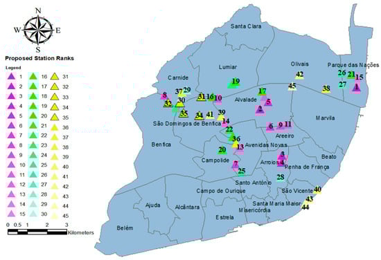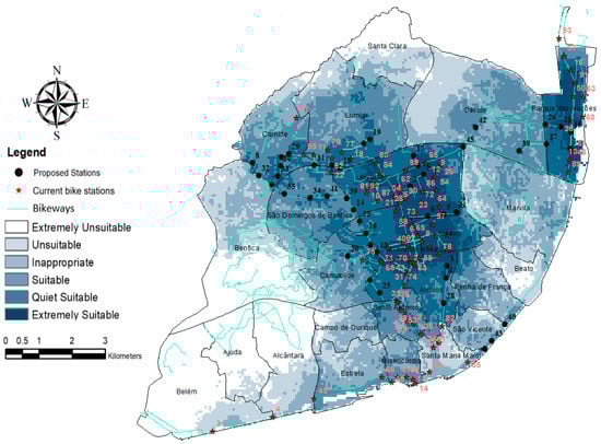Applying the MCDM-GIS method to the case study of Lisbon mapped the suitability zones for BSS station location. However, the areas were too vague, and we could not find any classification method to identify more specific alternative station locations (spots) [13]. Figure 2 illustrates the more suitable reddish areas with values ranging from 0.0379 to 0.0420 (bottom class in the legend’s scale). Interestingly, the places that scored greater than 0.0289 (median value of the scale) encompassed the current BSS stations, matching the selection procedure of EMEL’s planners. Therefore, due to the high construction cost of bike stations and initial budget constraints, we raised the bar for the area’s suitability for new bike stations and defined a lower limit of 0.0353 on the suitability scale. In addition, a minimum distance of 250 m was considered between the proposed stations and current stations [13,15], as the weights of criteria numbers 1 and 3 highlighted the importance of this factor. Figure 3 illustrates the areas suitable for installing new BSS stations. In the figure, areas with light colors are highly unsuitable, and areas with blue and pink colors have higher suitability. In Figure 3, the current bike stations are symbolized by red stars, and new proposed stations are identified by black circles next to the bikeways network. The new proposed stations are much closer to the bikeways by considering the suitable classification compared to the previous stations. In addition, in the location selection of the new proposed stations, the importance of criteria with high weight (see Table 4), such as population density and slope, had had a higher impact. Figure 3 shows the suitability differences between the location of the current stations and proposed stations. Based on Figure 3, stations 27, 55, and 11 are not in the appropriate locations, while the proposed stations 8, 32, 29, 30, and 33 are located in extremely suitable locations. In downtown, stations 46, 61, and 82 are located in less suitable locations in comparison to the new proposed stations in the same area, which are stations 28, 3, and 4.