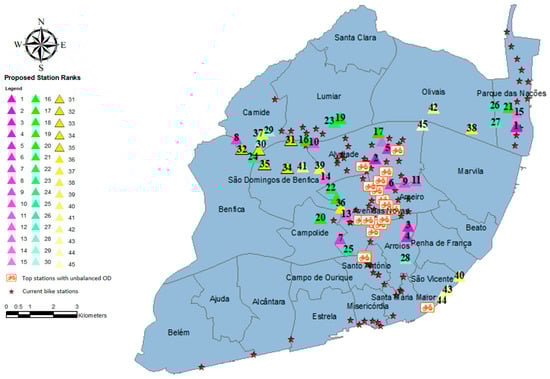 Many factors have an impact on the status of a station being balanced or unbalanced. Factors such as station location, the capacity of the station (rack numbers), initial bike inventory, differences in the actual and predicted demand for bicycles in stations, and others are included in Table 1. In this study, the factor of station location as one of the critical and most important was evaluated to have a lower unbalancing status in the expansion of a network. As mentioned before, previously proposed station location approaches generally exclude the demand and operational dimensions of BSS. Criteria number seven, “Proximity to the bike stations with unbalanced OD”, was included to contribute to solving the unbalancing problems of stations. An unbalanced station can be a full (close to full) station or an empty (close to empty) station. When the stations are full, adding capacity obviously solves a part of the problem; our proposed method correctly identified those unbalanced stations. Figure 5 shows the top unbalanced stations for the one-year operation of Lisbon’s BSS among all current stations and newly proposed and ranked stations. According to the study’s assumption that “unbalancing will decrease if the system’s criteria are also included in station location” and Figure 5, it seems that the hypothesis we adopted is correct.